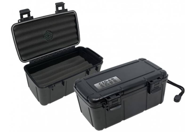 “15 Cigar Capacity Black Exterior Rugged Structure Water & Crush Resistant 3 Protective Foam Cigar Beds Rubber Gasket Seal Snap Tight Clips Lock Lid in Place Carrying Handle Humidifier Stores Cigars up to 7.5″” Long Dimensions: 8-11/16″” W x 4-7/8″” D x 3.8″” H”